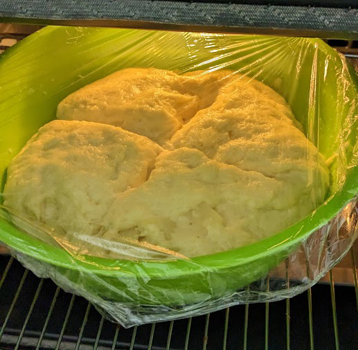 5. Coprire l'impasto con pellicola e lasciarlo lievitare nel forno spento con la luce accesa (circa 25°C)