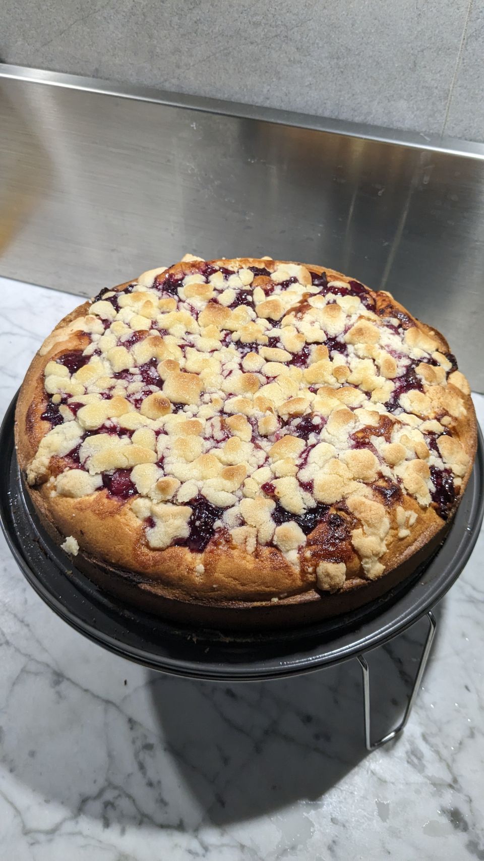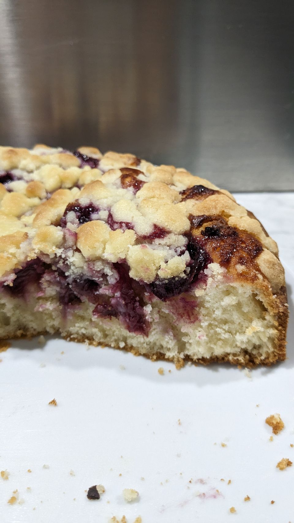 Distribuire su tutta la superficie le ciliegie e infine il crumble.